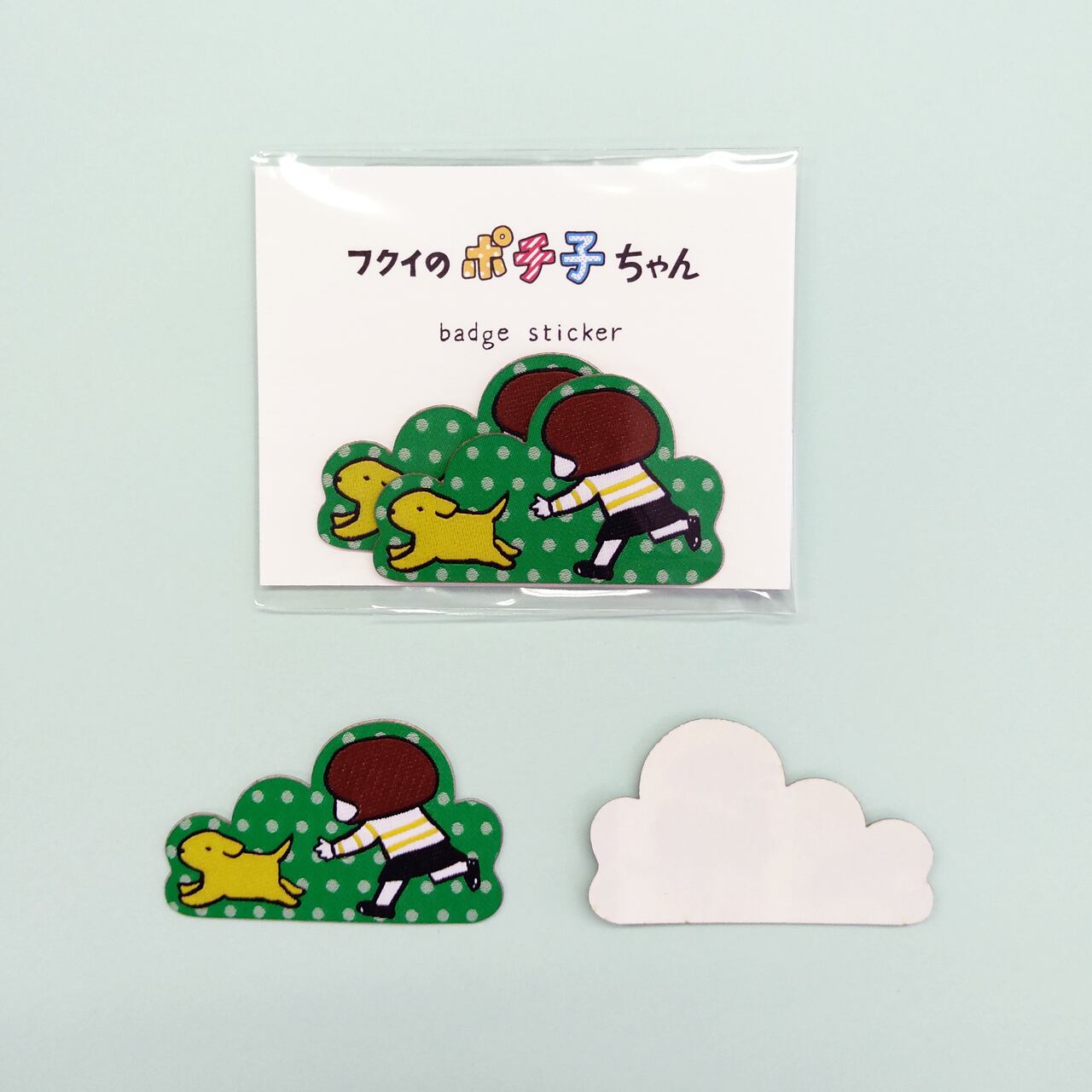 ブランドタグの織機でつくった織地のワッペンステッカーです。布製品へのアイロン接着だけでなく、ステーショナリーなどの紙製品に貼ることができます。ポチ子ちゃんとポチの「まてまてー」ワッペンステッカーでいろんなアイテムを楽しくデコレーションしてみてね!