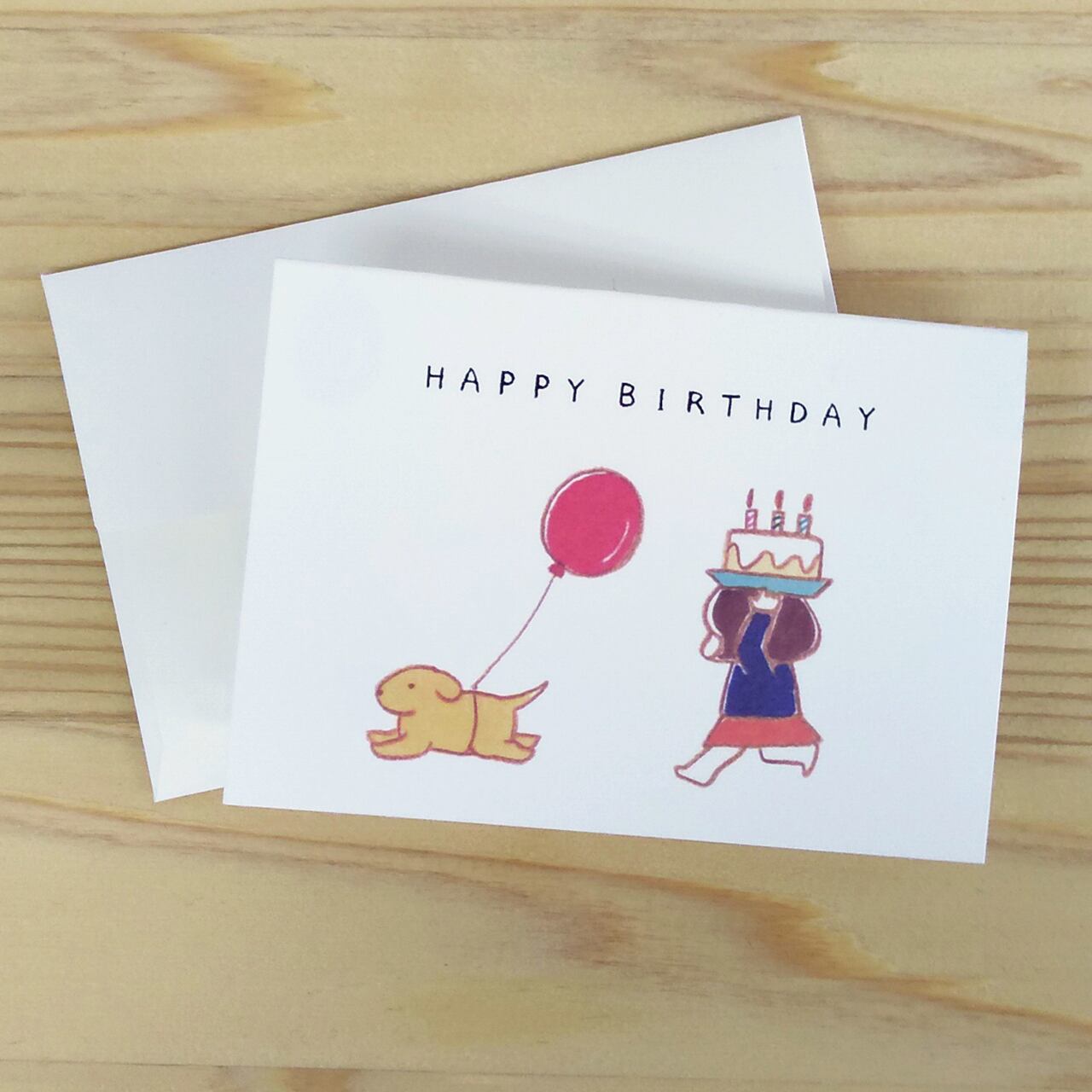 2つ折りの誕生日カードです。ポチ子ちゃんとポチが準備したバースデーパーティーのイラスト入りカードを贈り物に添えてみてはいかがでしょうか。大きさはハガキを2つ折りにしたのと同じくらいです。