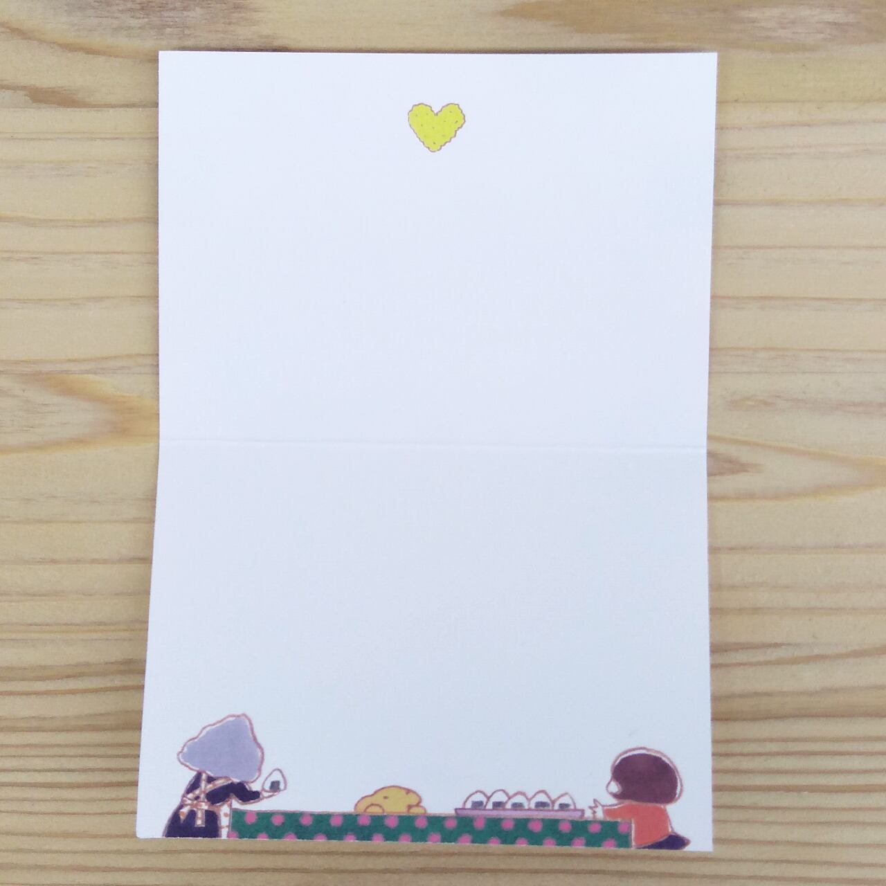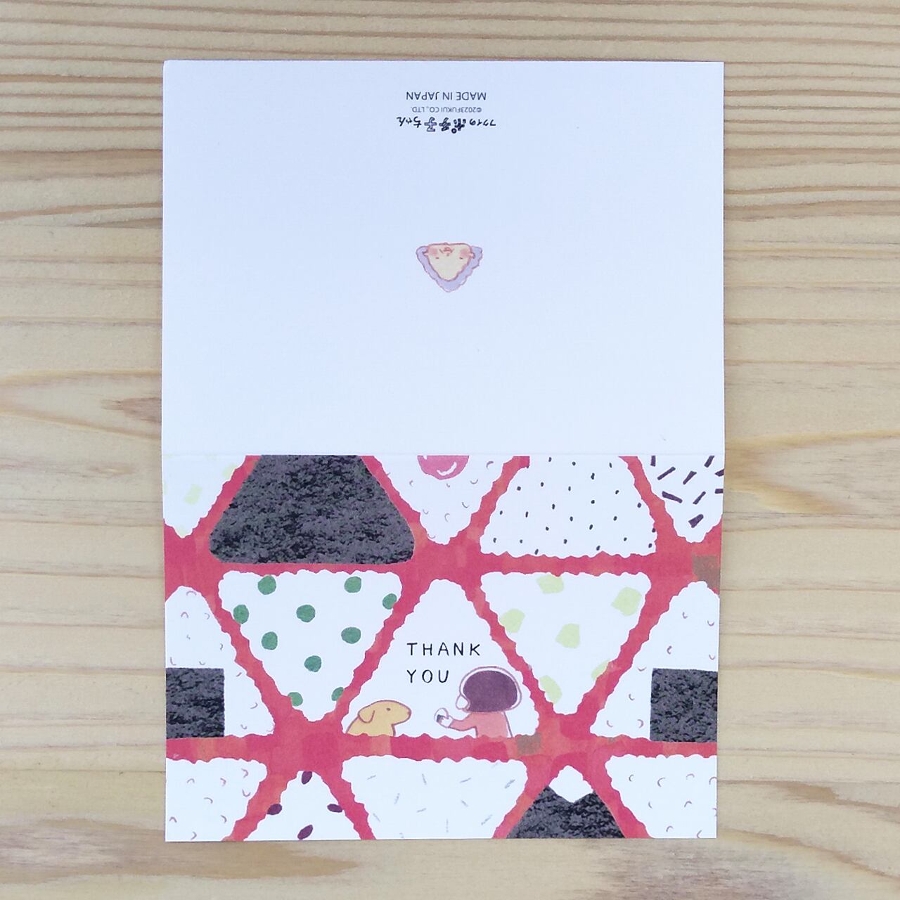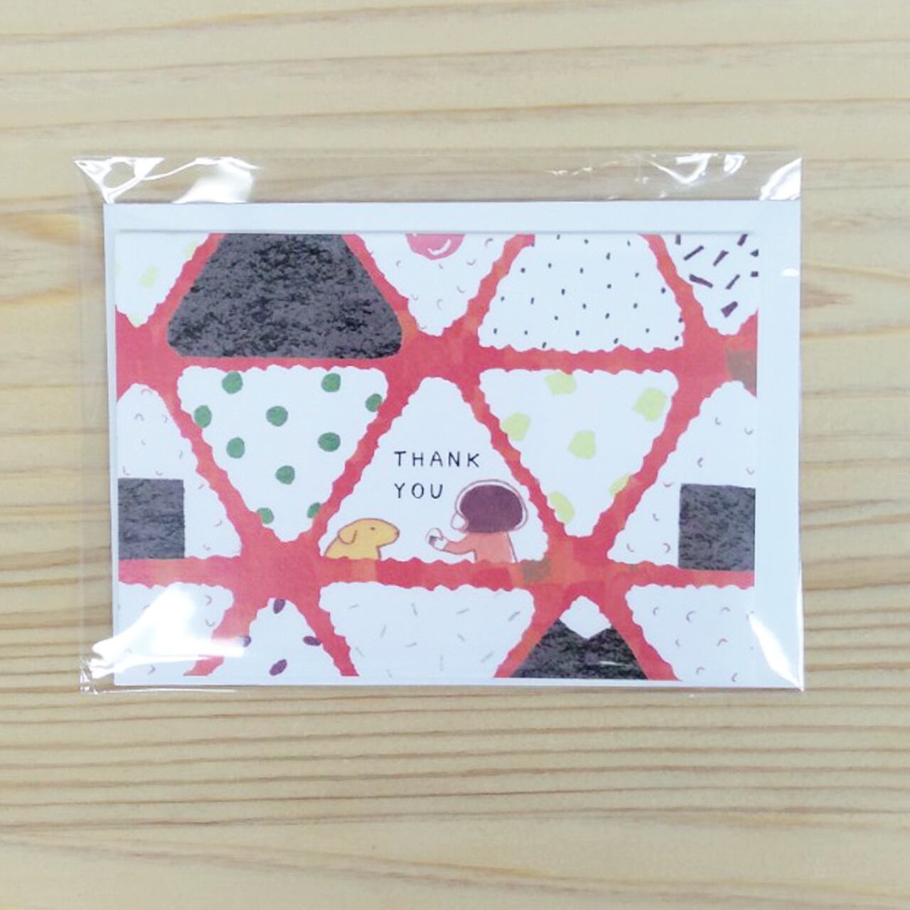 「ありがとう」の気持ちを伝えたいときにピッタリのカードです。いろんなオニギリのデザインのカードを、おみやげやおすそ分けの品に添えてみてはいかがでしょうか。大きさはハガキを2つ折りにしたのと同じくらいです。