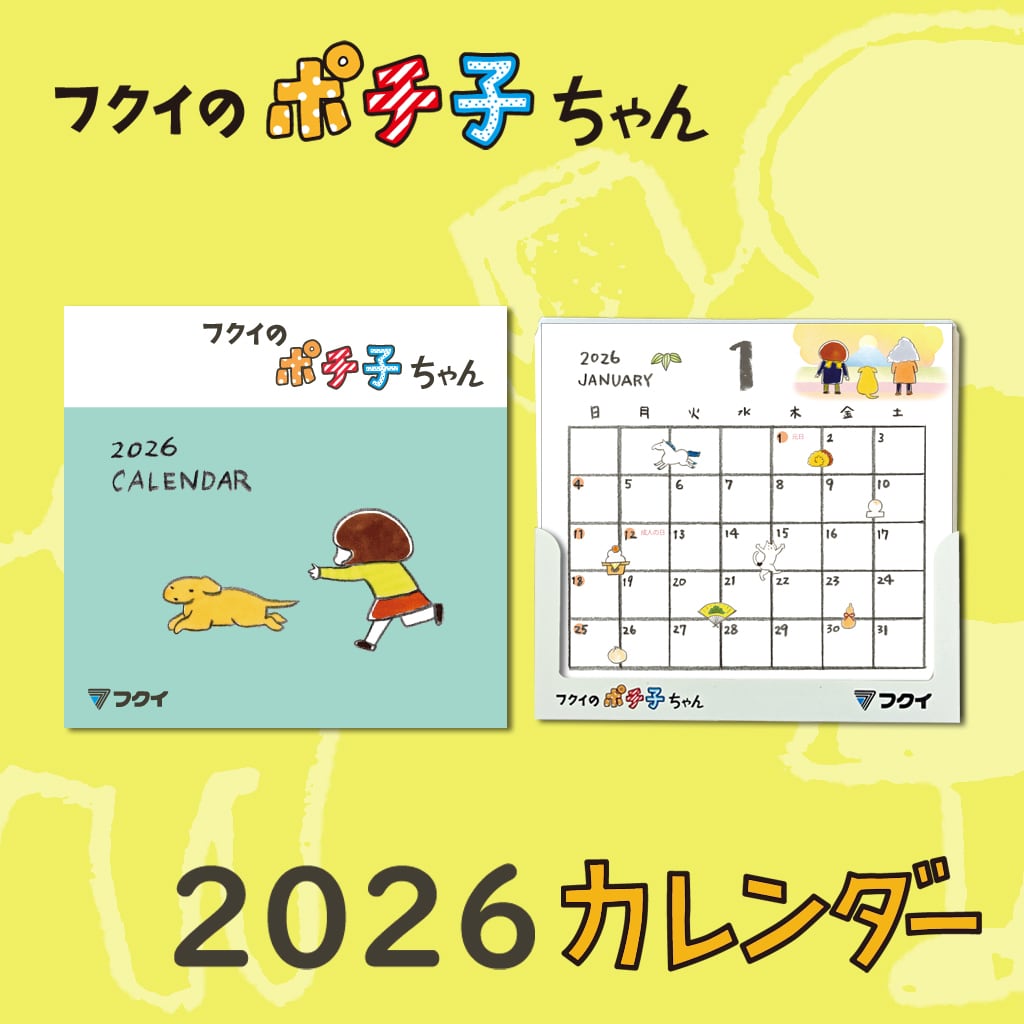 「フクイのポチ子ちゃん」のみんなが登場する卓上サイズのカレンダーです。パッケージを組み立てるとスタンドになります。パッケージにはさわって色がわかるタグ「いろポチ」の説明が入っています。